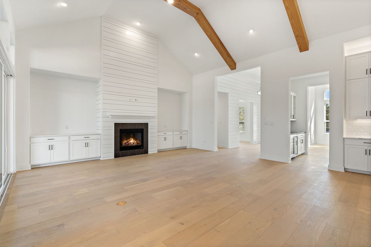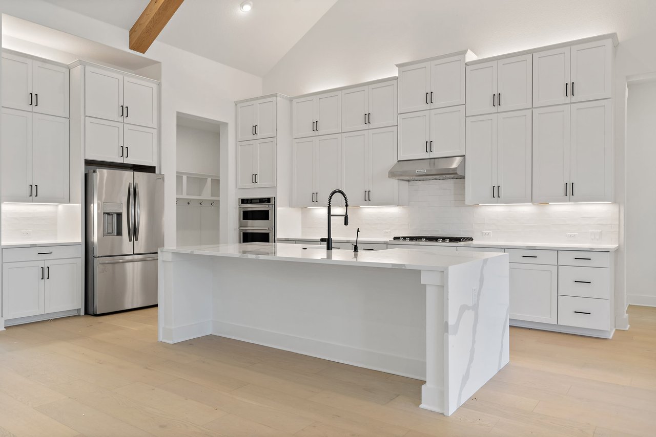 As you enter the home, you are greeted by a proud and outstanding foyer with a modern iron and glass door, that greets you to this warm and bright home with wood floors throughout and attention to detail with every finish, hand-picked for a seamless contemporary farmhouse aesthetic. The entry is flanked by the formal dining room with a butler alley to the kitchen, including a wine refrigerator, Quartzite counters, a sizable office, and shiplap accents. The home boasts the ideal floorplan with the primary bedroom on the opposite side of the home from the secondary bedrooms, and a natural flow with a drop station just inside the door from the oversized three-car garage. As you enter from the garage you will find a large utility room with built-in shelves and a roomy pantry. This COBE floor plan won a national design award by the National Builders Association.