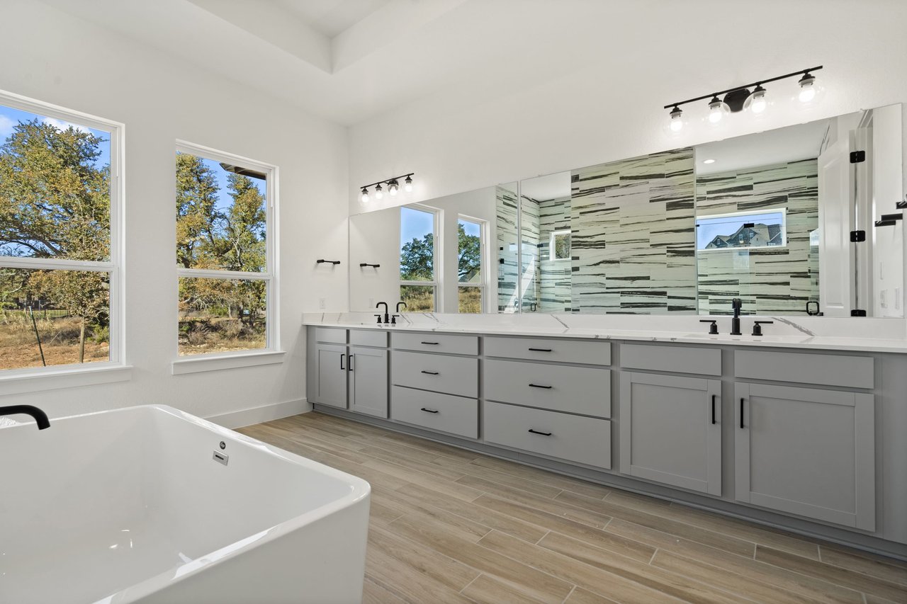 There are several living spaces within the home, and the second-floor media room can easily serve as a fifth bedroom with a full bath and closet. The kitchen has a huge center island/breakfast bar combo, Shaker-style cabinets, sleek quartzite countertops, gas range, stainless steel appliances, built-in microwave, and oven. It also includes a charming tiled backsplash, filtered water dispenser, and pull-out trash. Each bedroom has high ceilings and several have outlets 60” off the floor for easy tv mounting. There is also tons of storage and built-ins throughout the house. The Owner's Suite includes tray ceilings with custom wood accents and plenty of windows that look out onto the large backyard. The primary bath has dual vanities, a free-standing soaking tub, and a roomy walk-in shower with double shower heads and a dual walk-in closet. Sitting on nearly a full acre, this property is host to several oak trees and unobstructed views of the breathtaking Texas sky.