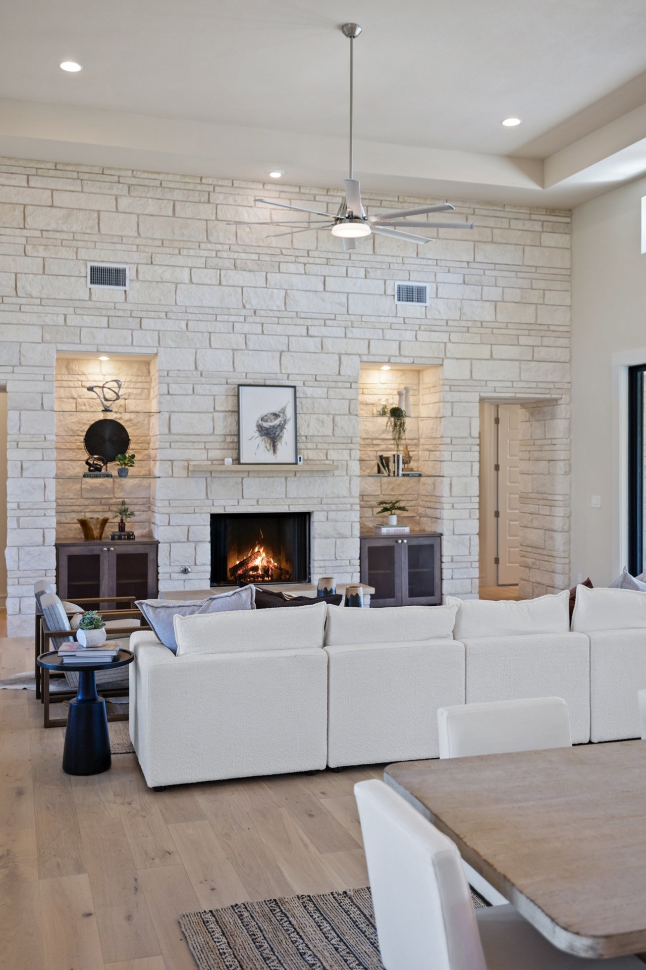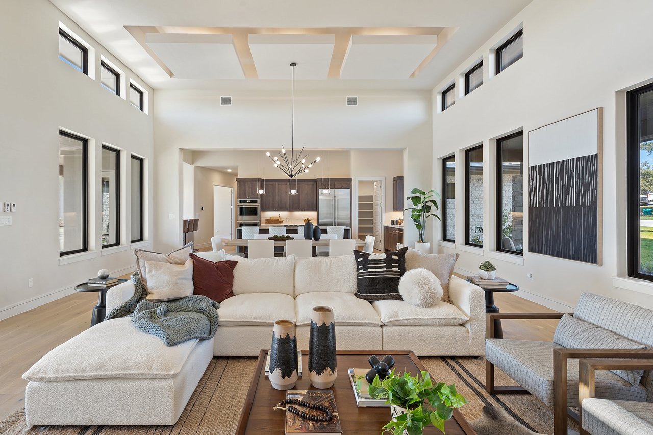 The interior showcases soaring ceilings and a dramatic floor-to-ceiling stone feature that flows seamlessly from the entryway through the great room to the outdoor living space. The kitchen, a chef’s dream, includes top-tier built-in appliances, a spacious island, and thoughtful design details. Modern conveniences like a sound system, smart thermostat, and energy-efficient windows enhance the home's functionality and eco-friendliness.